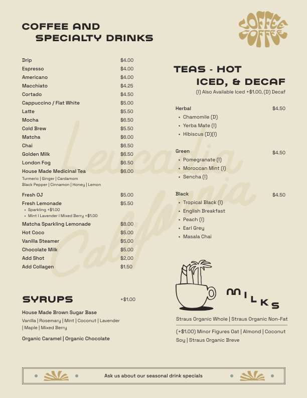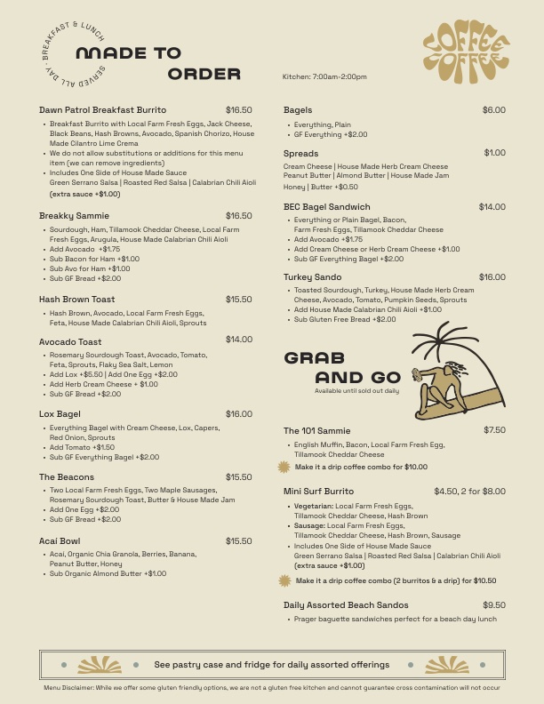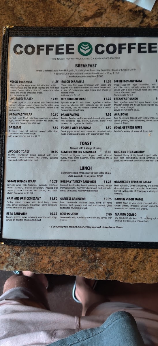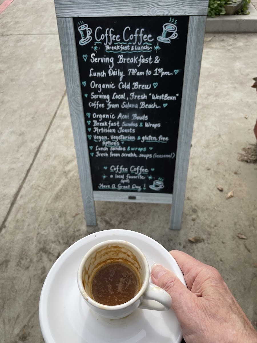 Welcome to Coffee Coffee, a delightful café nestled in Encinitas, California. Renowned for its inviting atmosphere, this café is more than just a place to grab a caffeine fix—it's a community hub. With a menu that tantalizes, you'll find breakfast options ranging from the hearty Veggie Scramble to the classic Lox Bagel Plate. Their specialty toasts, like Avocado Toast, are a must-try for a fresh start to your day.